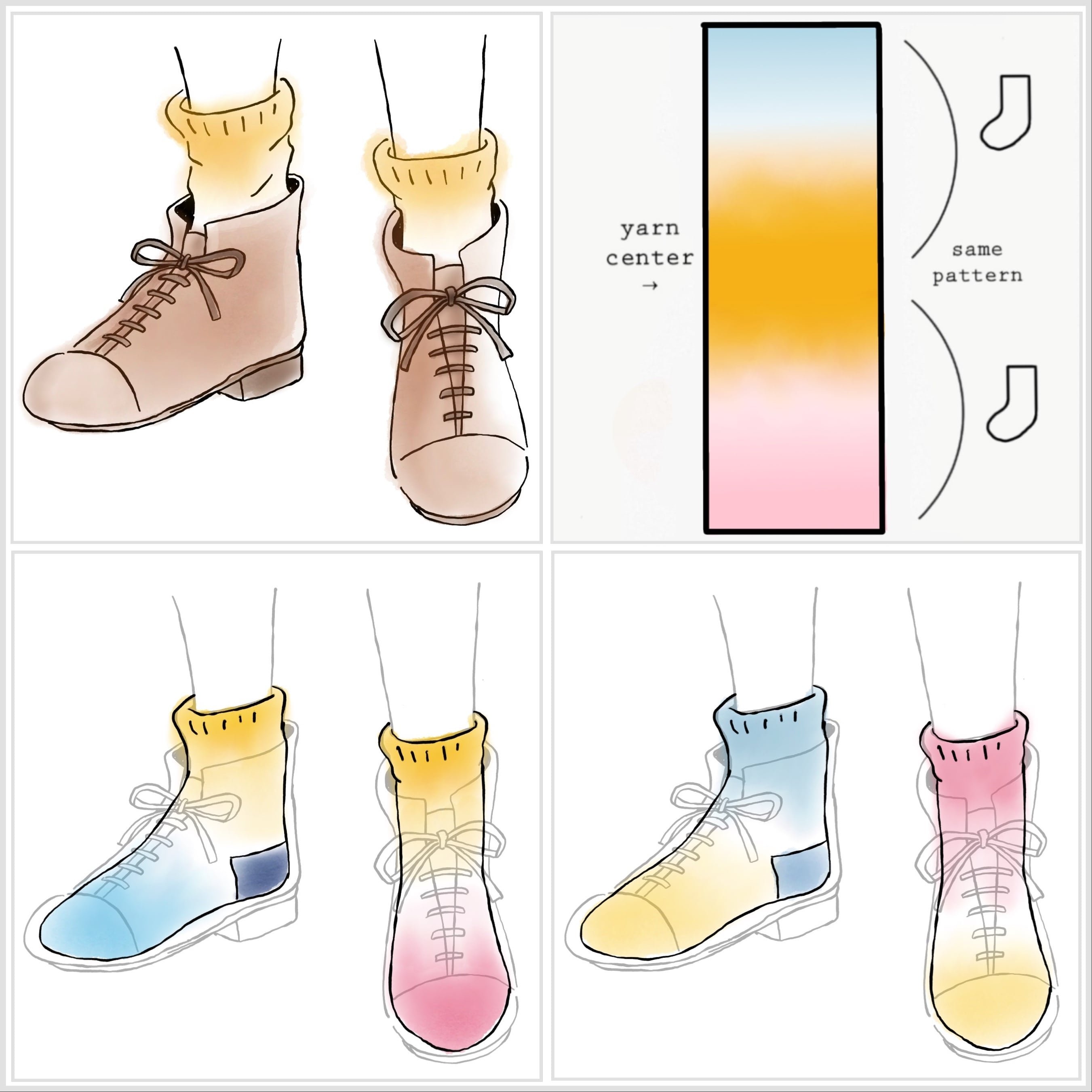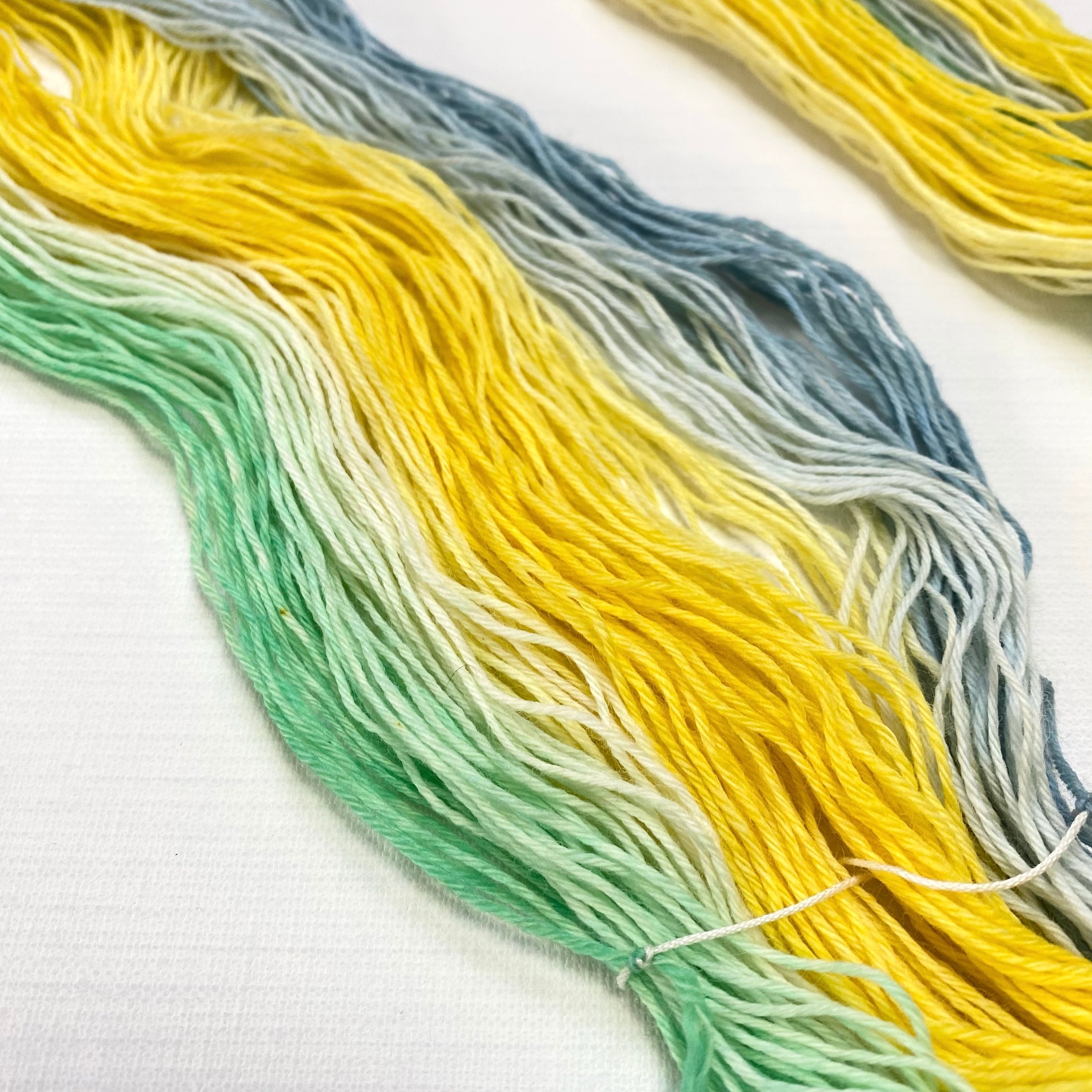 靴下など2つで1組のものを編む為に染めた中央反転染めです。