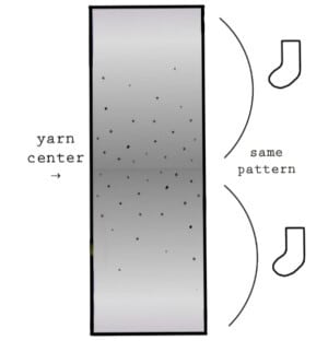 糸を中央で分け、それぞれを両端(もしくは中央)から編むことで、ほぼ同じような色変わりで編み進められます。